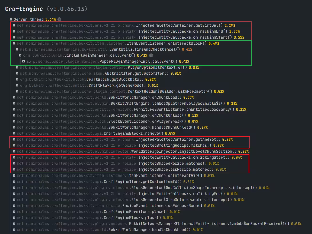 Classes starting with "Injected" (marked in red in the image) These classes are injected by CraftEngine. Therefore, some performance consumption originally belonging to the server will be attributed to CraftEngine in the analysis.